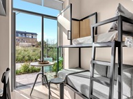 Lejligheden har en køjeseng (fås i stueetagens lejligheder), hvilket gør den velegnet til fælles ophold. Den tilbyder også opbevaringsskuffer og -skabe samt et fleksibelt skrivebord, der kan fungere som arbejdsområde eller siddeområde. Badeværelset er rummeligt og har separat bruser, lyse fliser og gulvvarme.