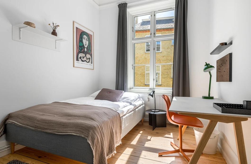 Denne smukke klassiske københavnerlejlighed består af 6 værelser, alle enkeltværelser. Der er et stort moderne køkken med spisebord og kogeø, 1 større og 1 mindre opholdsstue, en solrig balkon og to fælles badeværelser. Lejligheden ligger på 3. sal med udsigt over den lyse og rummelige Vester Voldgade. Vandet er et stenkast væk, og om sommeren er dette det perfekte sted at tage en svømmetur. Lige rundt om hjørnet finder du også Det Kongelige Bibliotek, Tivoli og Rådhuset. Hovedbanegården ligger kun 5 minutters gang væk. Og ikke at glemme, Iboo's takeaway i stueetagen med nogle virkelig lækre retter fra Pakistan.